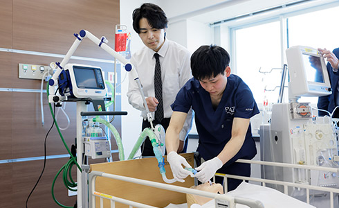 学内実習では現場経験豊富な教員の指導のもと、実際の医療現場を想定し、人工呼吸器、人工心肺装置、血液浄化装置(透析装置)など、実際の医療機器を操作しながら実践力を身に付けます。また、複数のグループに分かれ、協力し合いながら課題に取り組むことにより、協調性や課題に対する思考力、洞察力、判断力を身に付け、チーム医療の中心となる人材を育成します。