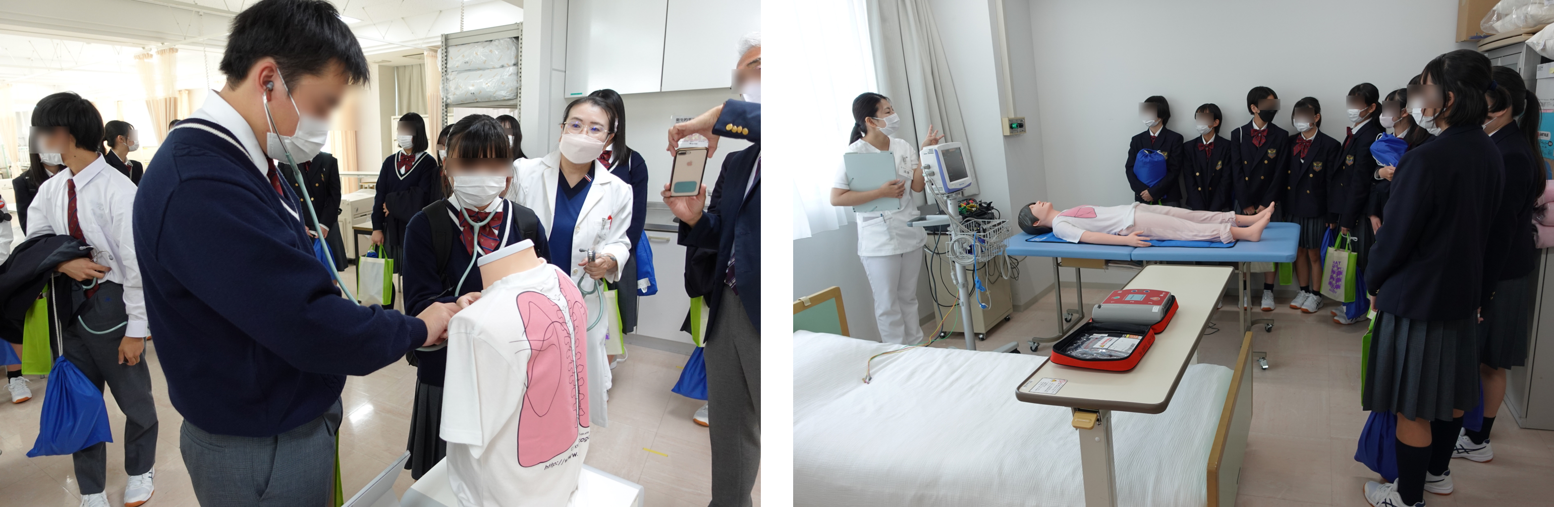 看護学科では、基礎・臨床看護学実習室にて様々な演習機器を見学しました。また、心臓の音・呼吸の音・肺の音を再現できるラングと呼ばれるモデル人形に聴診器をあてて実際に呼吸音を聴いていただきました。