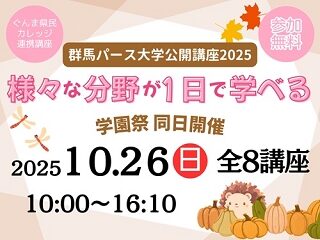 群馬パース大学地域連携センターでは、地域貢献を目指す取り組みの一環として、日ごろの教育・研究の成果を地域社会に還元するとともに、皆さまの生涯…