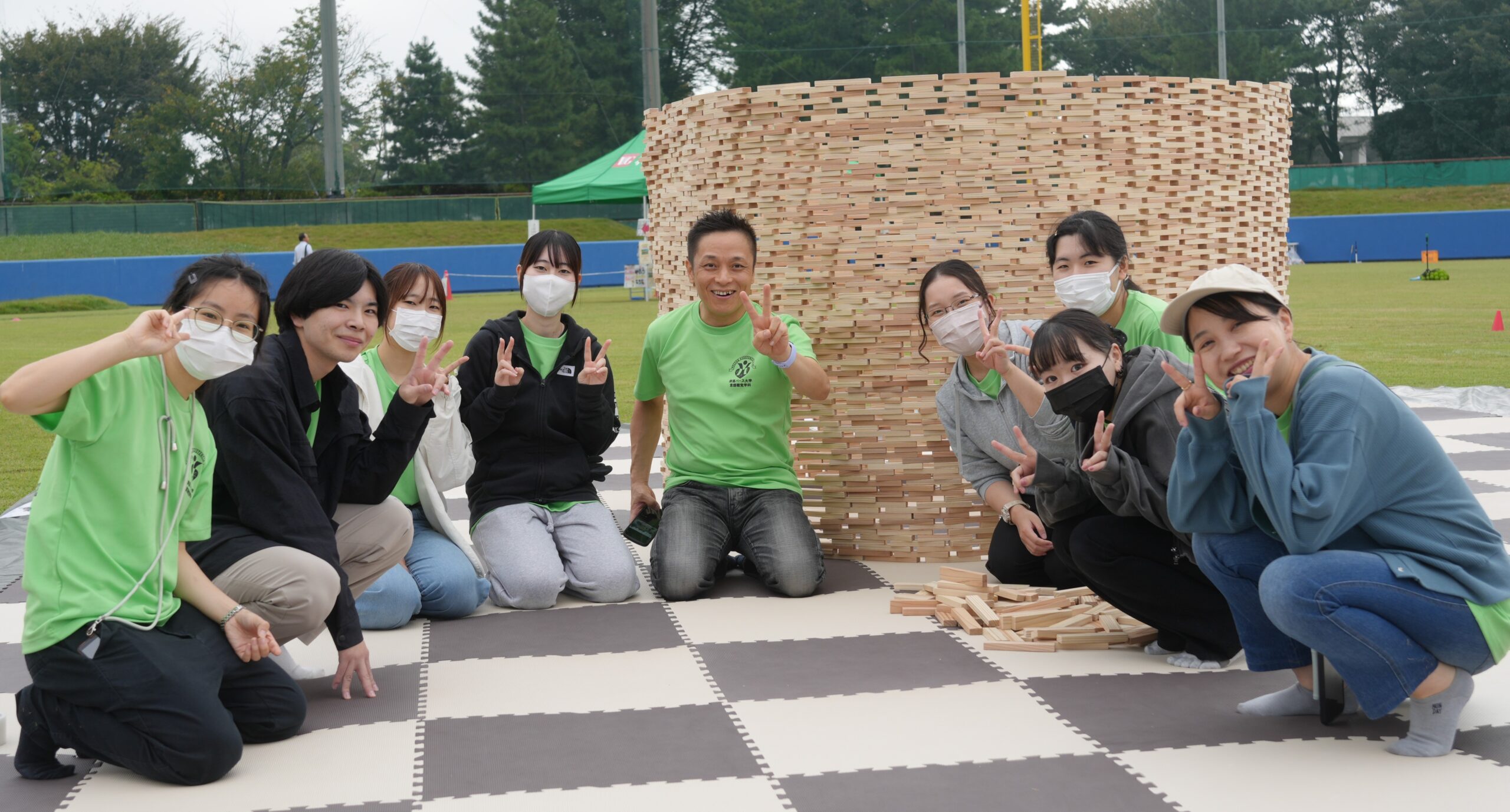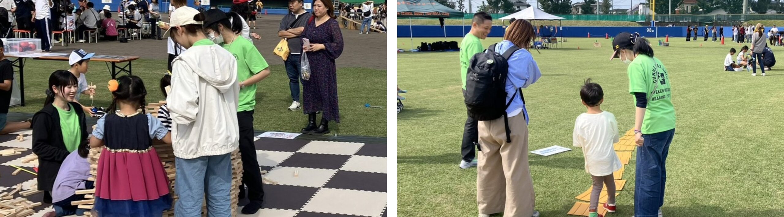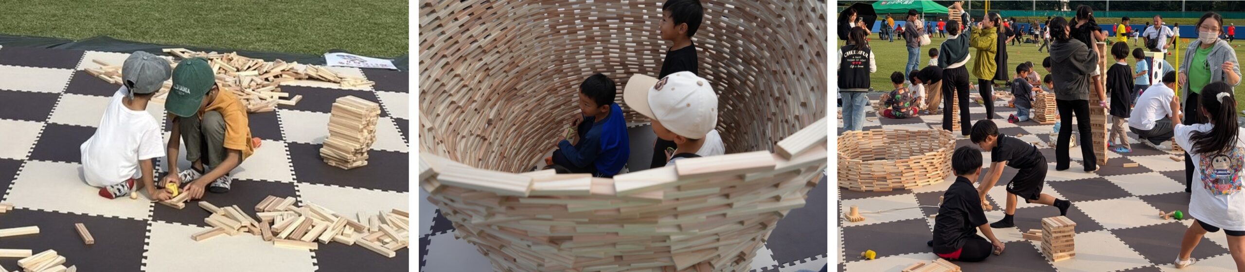 当日はセブンナッツスタジアム中央に『パースあそびの森』を展開し、木のつみきを使って、学生たちと子どもたちが一緒に遊び、楽しい空間が広がりました。