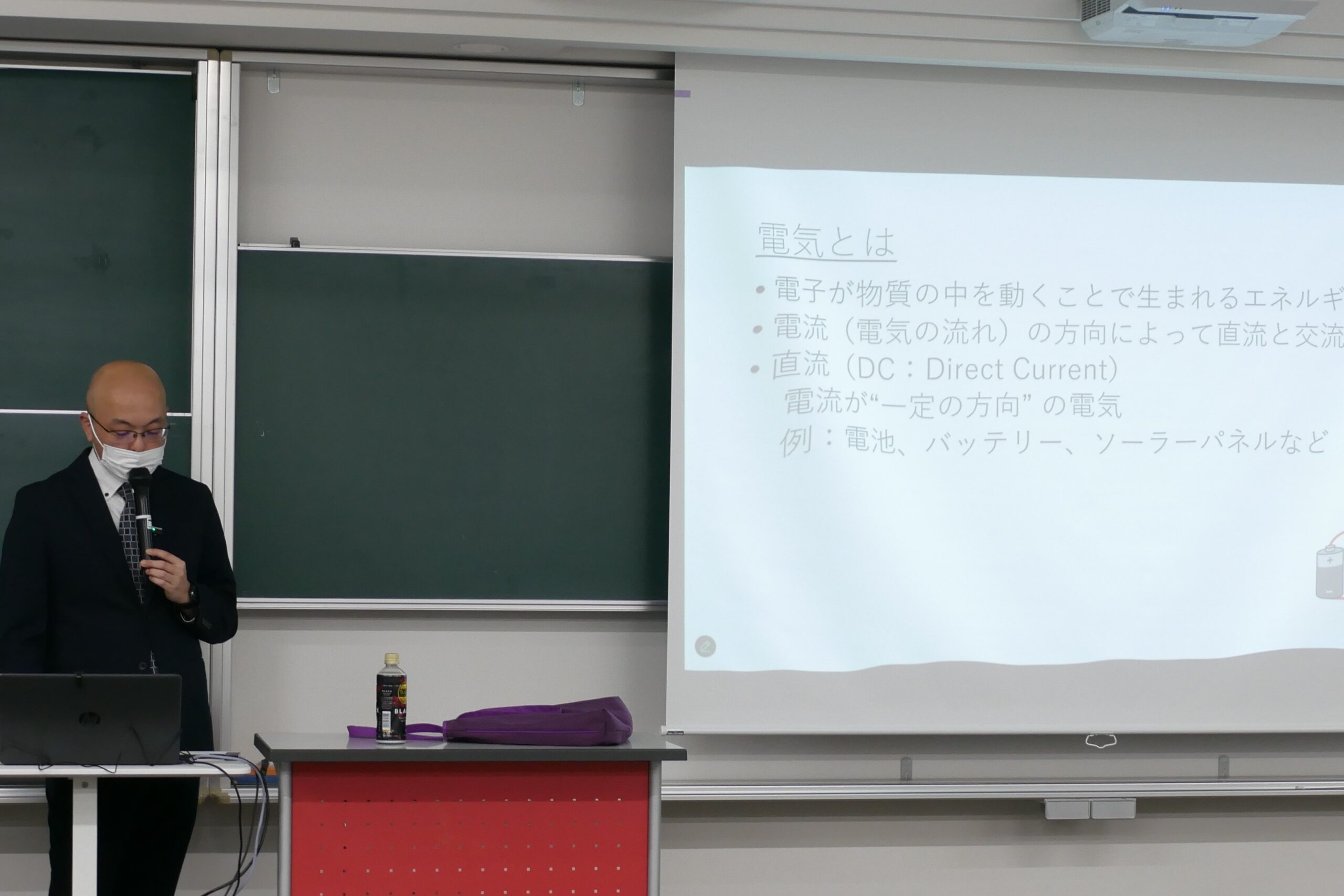 【概要】電気の特徴の一種である、直流電気や交流電気の基礎から商用利用を、実際の例を用いて講義を行いました。その上で、人体での電気特性や電気を用いた医用治療機器であるAEDや電気メス、ペースメーカーなどについてお話ししました。