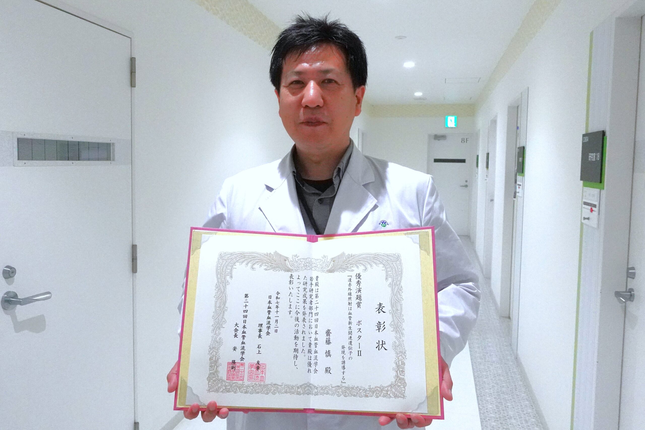 日本血管血流学会学術集会での初めての発表でしたが、このような形で評価いただき、大変光栄に存じます。本研究成果を基盤として、今後は血管新生に関与するタンパク質の発現や機能を詳細に解析し、プロテオーム解析を通じて血管新生の分子メカニズムをさらに明らかにしていきたいと考えています。