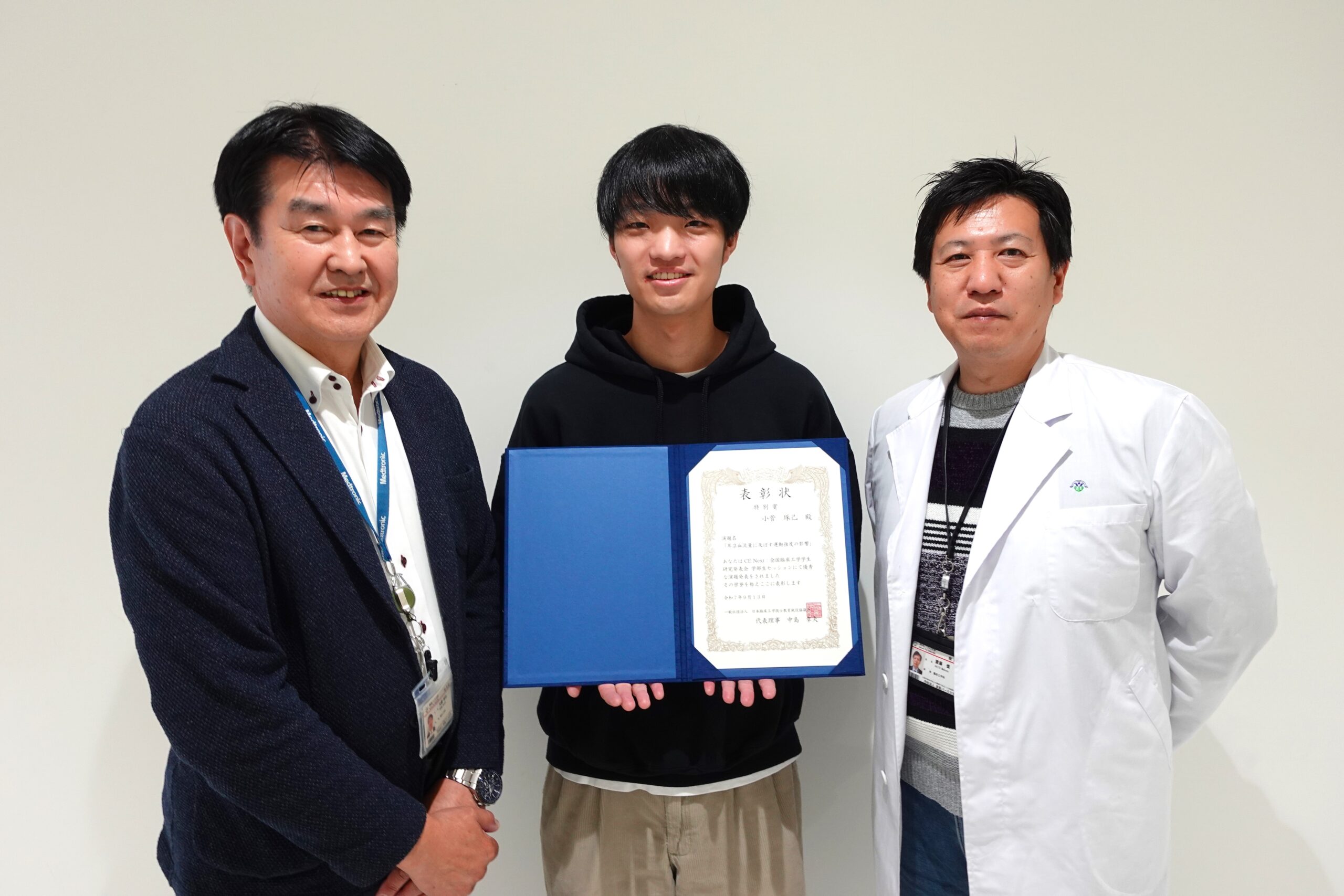 ▲向かって左から、臨床工学科 大濵 和也 学科長、臨床工学科4年 小菅 琢己 さん、臨床工学科 齋藤 慎 講師