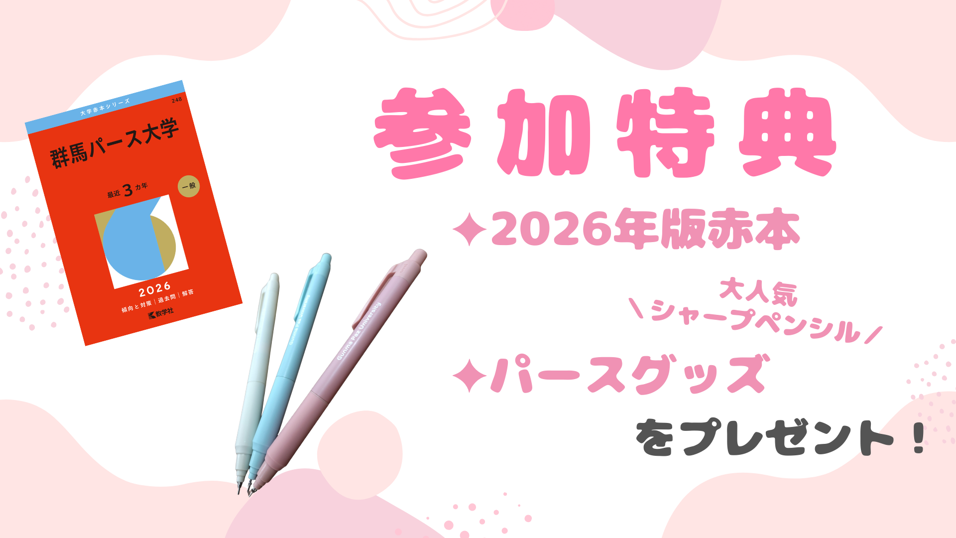 ①参加特典として『2026年版赤本』と『パースグッズ』をプレゼント!