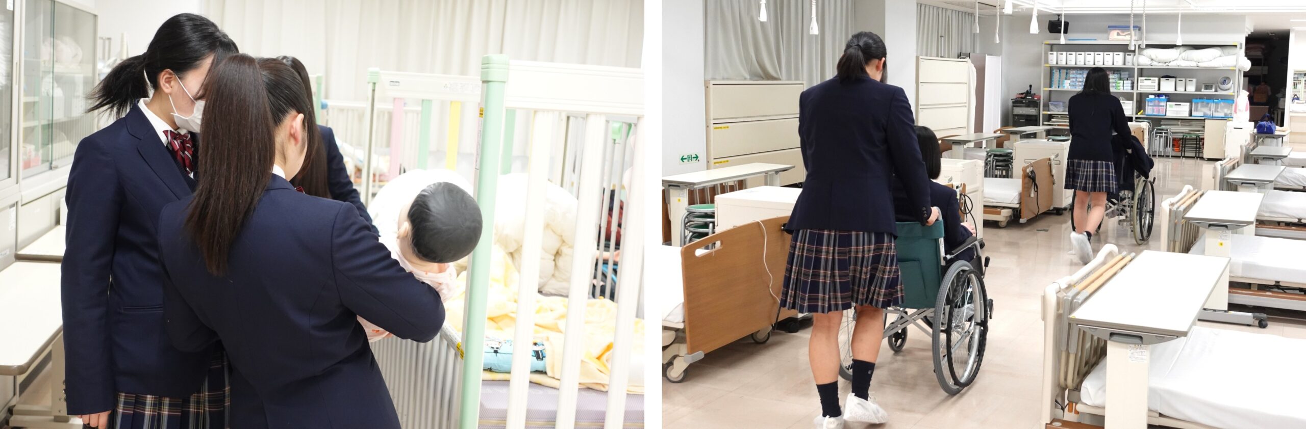 「基礎・臨床看護学実習室」を見学しました。80人程度の学生が一度に演習ができる実習室の広さとベットの数に驚いた様子でした。看護師の基本的なスキルや、患者さんとの関わりの大切さについてお話ししながら、看護師のやりがいや魅力を伝えました。