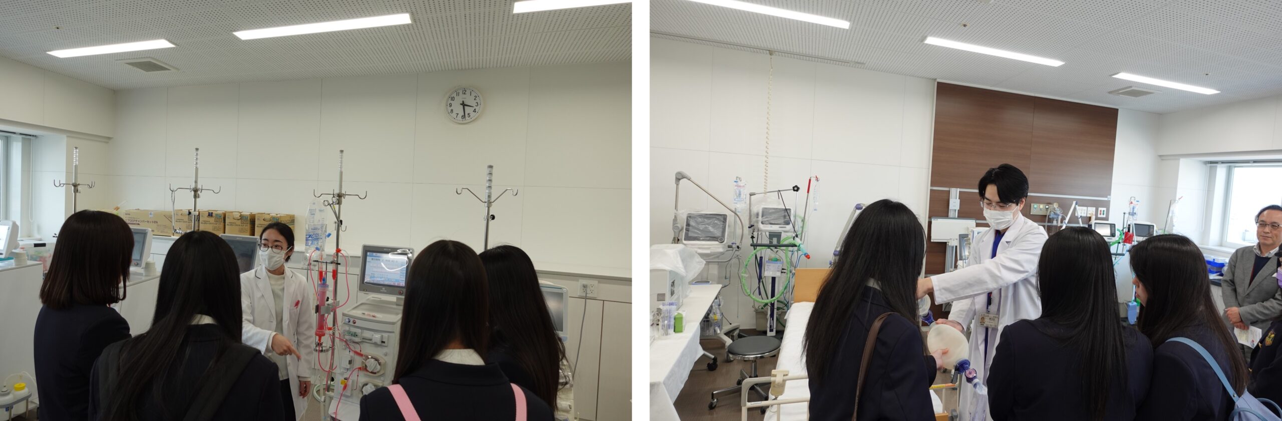 4号館11階の臨床工学実習室を見学しました。実習室にある血液透析装置やECMO(体外式膜型人工肺)などの機器がどのような治療に使われているのかを学んでいただきました。