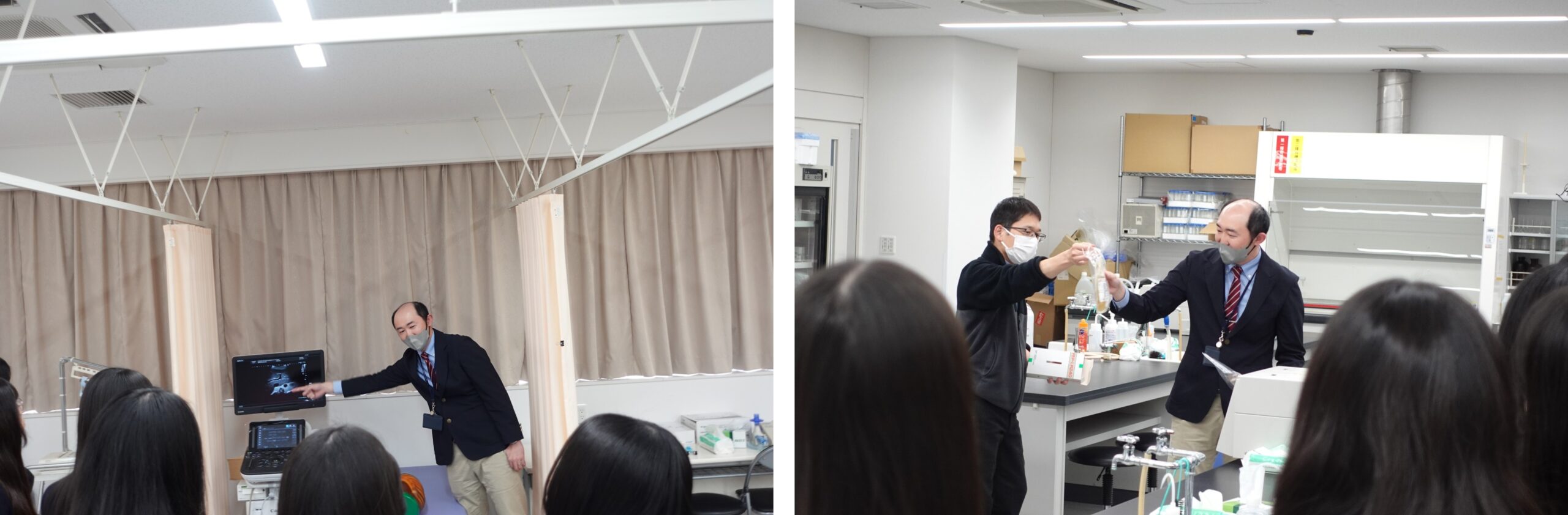 2号館4・5階の各実習室を見学しました。PCR検査や血液検査、超音波検査など、学生が普段どのような勉強をしているかを実習室を周りながら知っていただきました。臨床検査技師の仕事を具体的にイメージできたのではないかと思います。