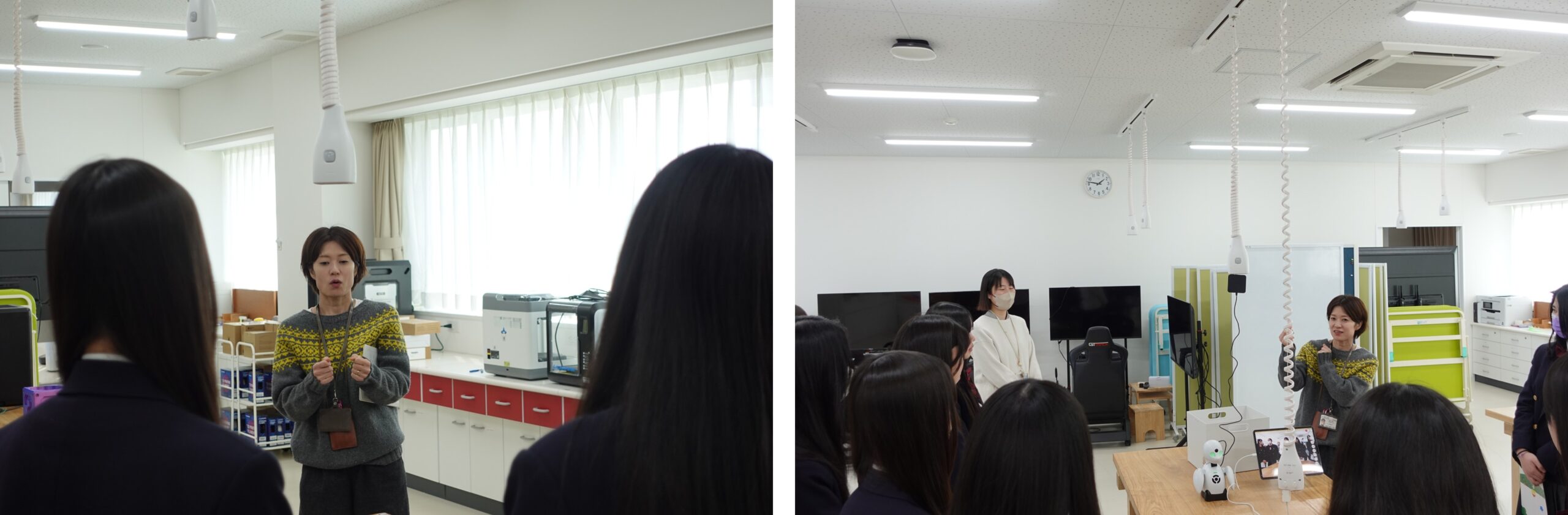 1号館ANNEX別館5階『基礎作業実習室』を見学しました。作業療法士は「作業」と呼ばれる日常生活のありとあらゆる動作(例:歯を磨く・料理する・服を着る)に対して、支援を行う医療職であるということを理解していただきました。また、ロボットや3Dプリンターなど最先端の機器を実際に触れて体験していただきました。