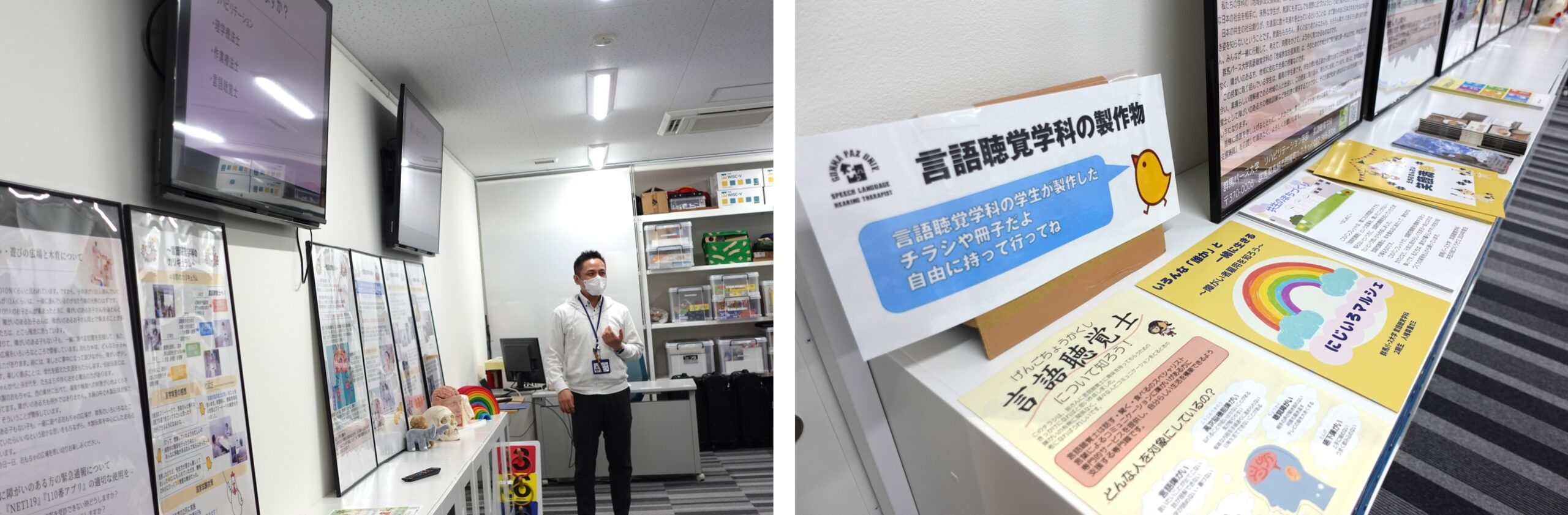 1号館別館4階の実習室を見学しました。実習室にあるモニターを使って、言語聴覚士とリハビリテーションについて説明を行いました。「初めて言語聴覚士を聞いた」という声が多く、この機会に言語聴覚士という職種に興味を持っていただけたら嬉しいです。