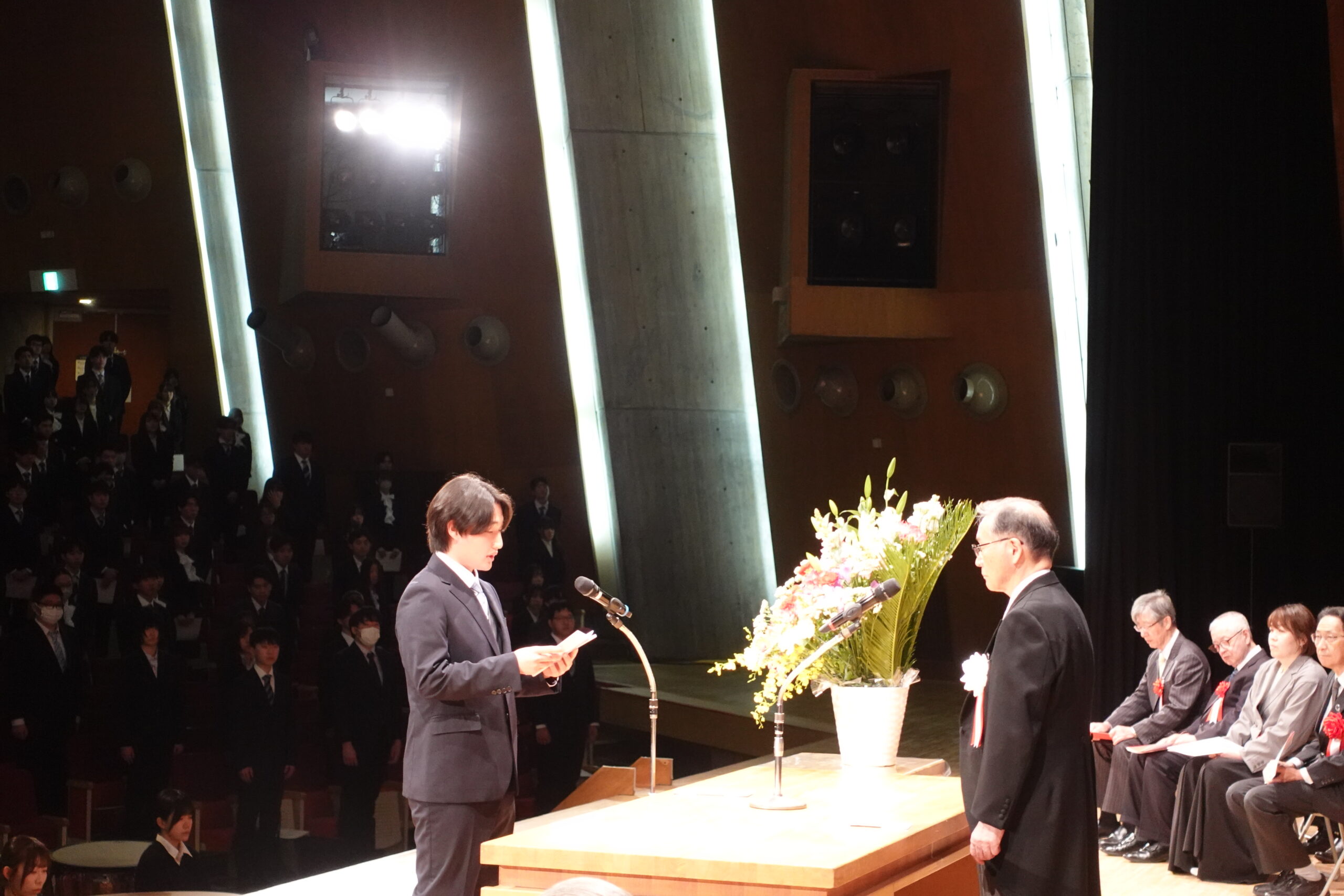 新入生を代表して、医療技術学部 臨床工学科 須賀 瑠偉さんは、感染症の流行や災害の頻発、少子高齢化の進行、さらにはICTやAIの発展などにより医療を取り巻く環境が大きく変化していることに触れ、今後の学びを通して専門知識と技術の習得に努めるとともに、他職種への理解と尊重を大切にしながら、信頼されるチーム医療の一員として成長していく決意を表明しました。そして、新入生一同が未来の医療を支える担い手となるべく、誠実に学び続けることを誓いました。