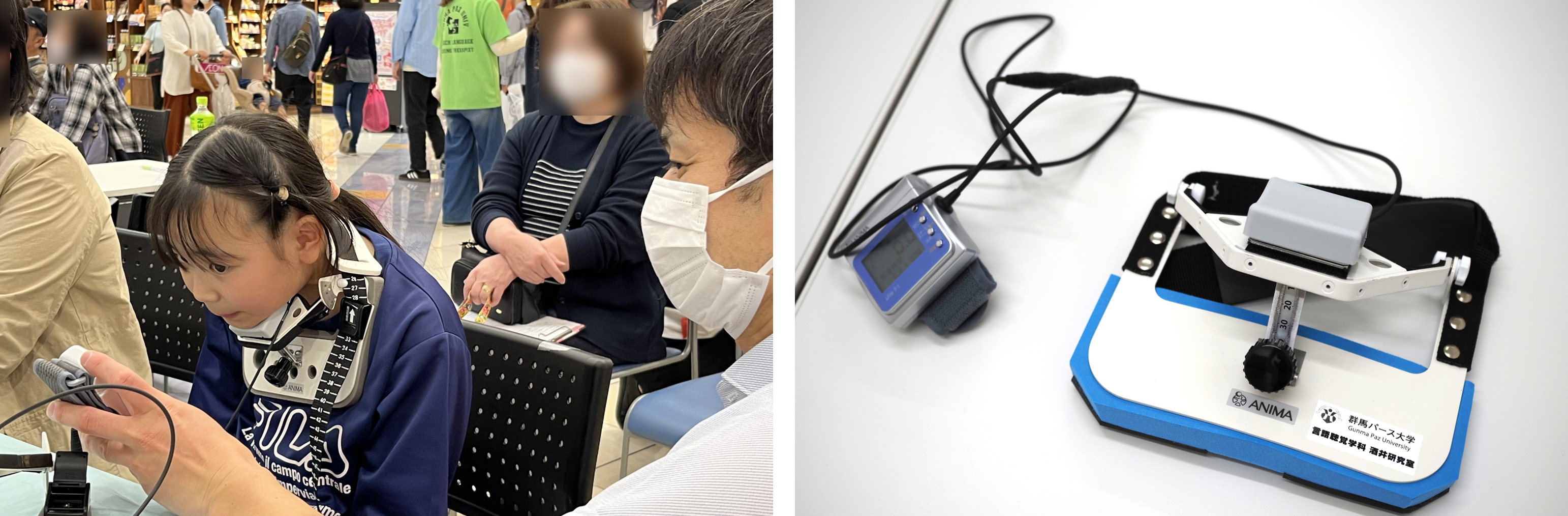 ▼頸部の筋力測定(飲み込む力の測定)の様子。写真右のような機械を首に装着し、顎を引き下げる動作を行います。
